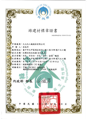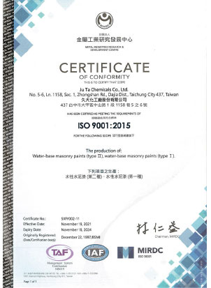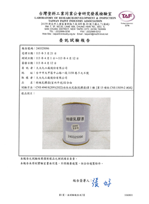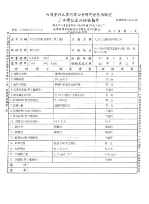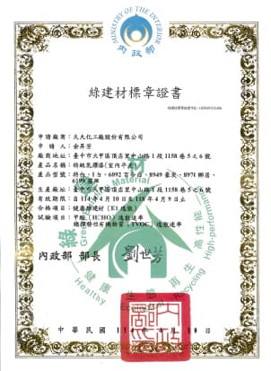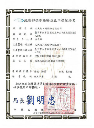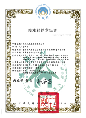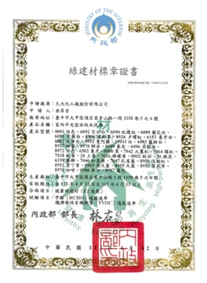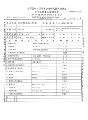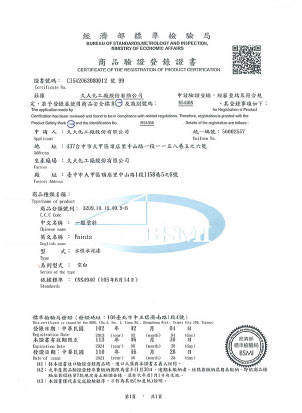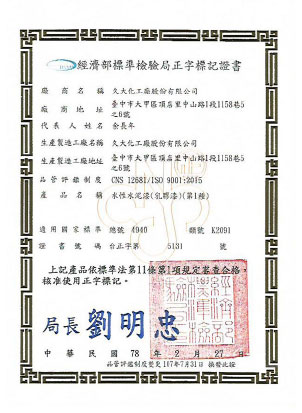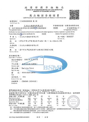 獲經濟部中央標準局頒發之乳化塑膠漆平光型塗料(台正字第5131號)、水性水泥漆有光型塗料(台正字第5133號)、溶劑型水泥漆(台正字第5232號)正字標記証明書。